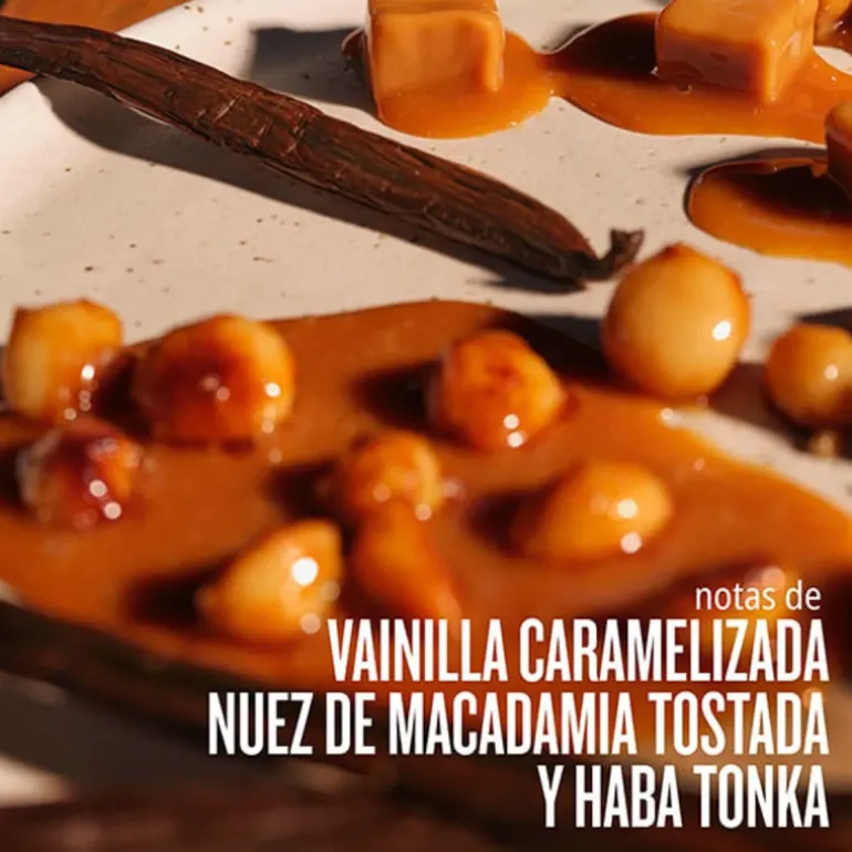 Cálida y acogedora, esta fragancia decadente te envuelve en el confort de la vainilla caramelizada rociada sobre nuez de macadamia tostada y rico haba tonka.