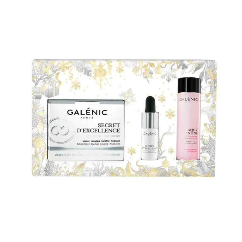 Este Galénic Secret Set of Excellence contiene su excepcional rutina antienvejecimiento. Está compuesto por La Crème Secret d’Excellence 50ml, Secret d’Excellence Concentrated Serum 10ml y Aqua Infini Care Lotion 40ml.