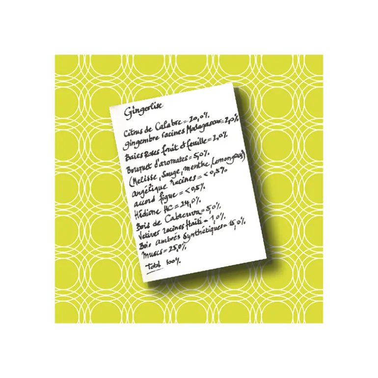 Madagascar, tierra de colores y contrastes. La inspiración de la perfumista, Alexandra Carlin para la creación de GIngerlise, nace cuando descubre una variedad endémica de jengibre que se vuelve de color azul al contacto con la luz. La luz es la hija de Ariana en la Creación, el reecunetro del cielo y la tiera ocre. UNa explosión refrescante de cítricos que anuncia el inicio de las fiestas y se unen al jengibre con matices de limón y de verbena. Poco a poco la raíz de Angéliza potencia los matices terrosos del jengibre, y los cítricos dejan paso al ámbar y al musgo para completar una tarde de sol en la isla roja. El cielo y la Tierra por fin reunidos.