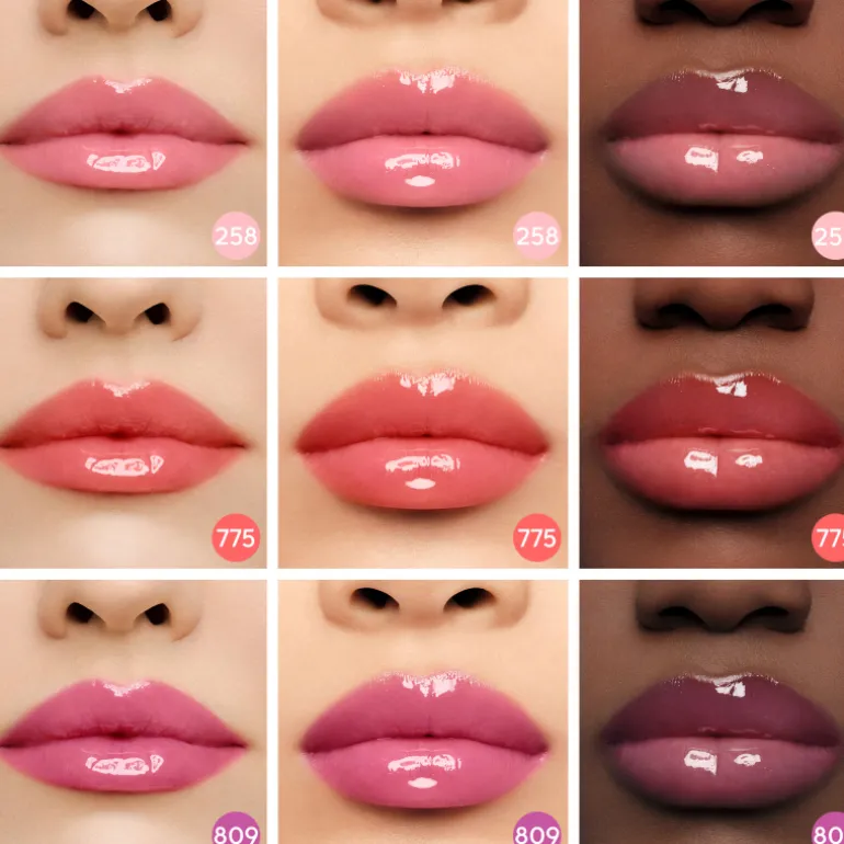 KissKiss Bee Glow Oil se presenta en 6 tonos brillantes que combinan con los del bálsamo-tratamiento con color KissKiss Bee Glow, incluidos sus 3 tonos estrella: