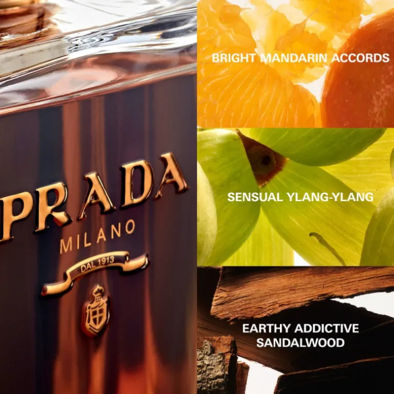 Una fragancia innatamente femenina, ofrecida en un frasco de metal dorado con el logotipo original de Prada sobre piel Saffiano rosa.