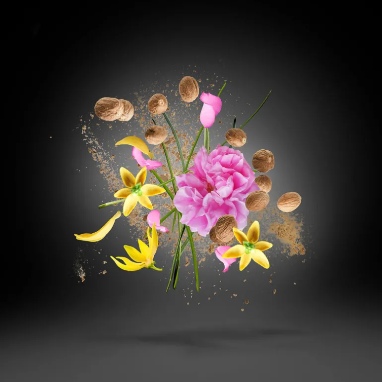 Un toque vibrante de nuez moscada y frutas, acentuado con prominentes ylang ylang y rosa turca se alza junto al espíritu floral y picante, a la madera de cedro, al almizcle y a la vainilla.