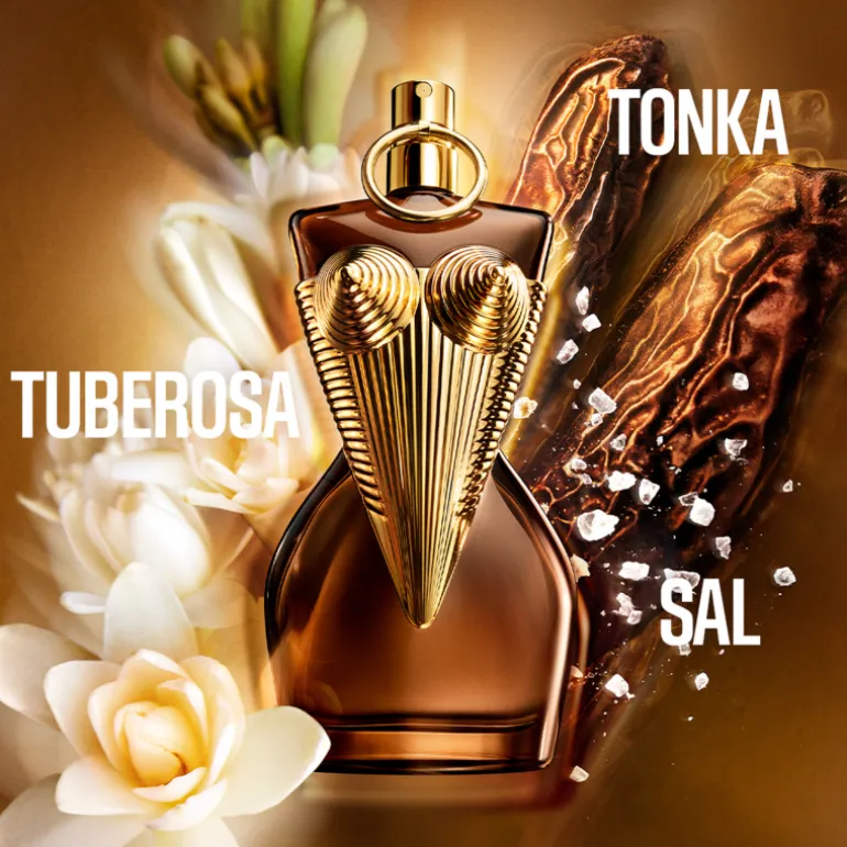 Gaultier Divine Elixir fascina con la exuberancia de su perfume ambarino floral marino en un frasco de ámbar y oro.