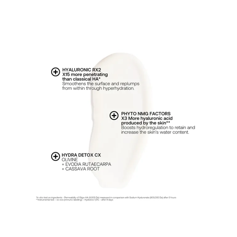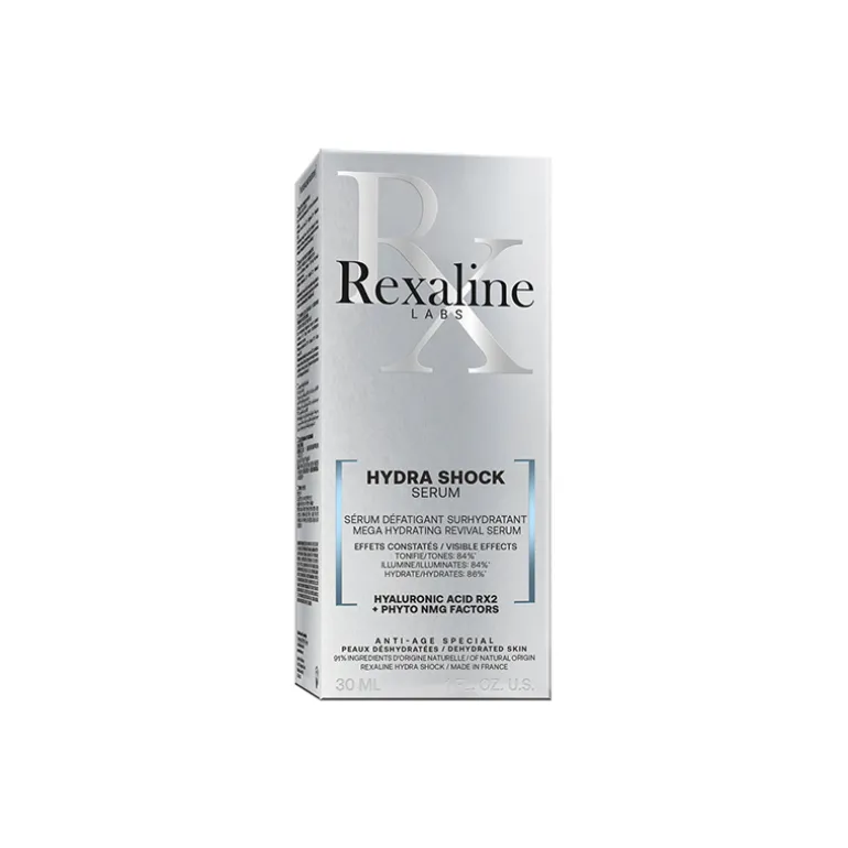 Rexaline Hydra Shock Serum, Suero Defatigante Superhidratante. El aliado de la piel apagada y sedienta, formulado con ácido hialurónico Rx2 súper hidratante, que penetra 15 veces más que el ácido hialurónico estándar*, y un complejo bioactivo basado en factores fito-NMG que rellenan la piel.
