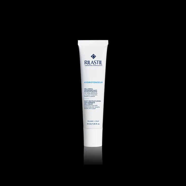 Rilastil Hydrotenseur Gel-Crema Antiarrugas con textura ligera y efecto matificante y antimanchas, específica para hidratar la piel en profundiad, además de prevenir y tratar los primeros signos de envejecimiento cutáneo en pieles mixtas y con impurezas. Con una exclusiva mezcla de ácido hialurónico con tres rangos de peso molecular diferentes con efecto sinérgico para hidratar, rellenar y reparar la piel, contrarrestando las arrugas y devolviendo el grado óptimo de elasticidad a la piel. Las ceramidas, el Lupeol y el Miolift completan la fórmula para un efecto reparador, reafirmante y antiarrugas intensivo.