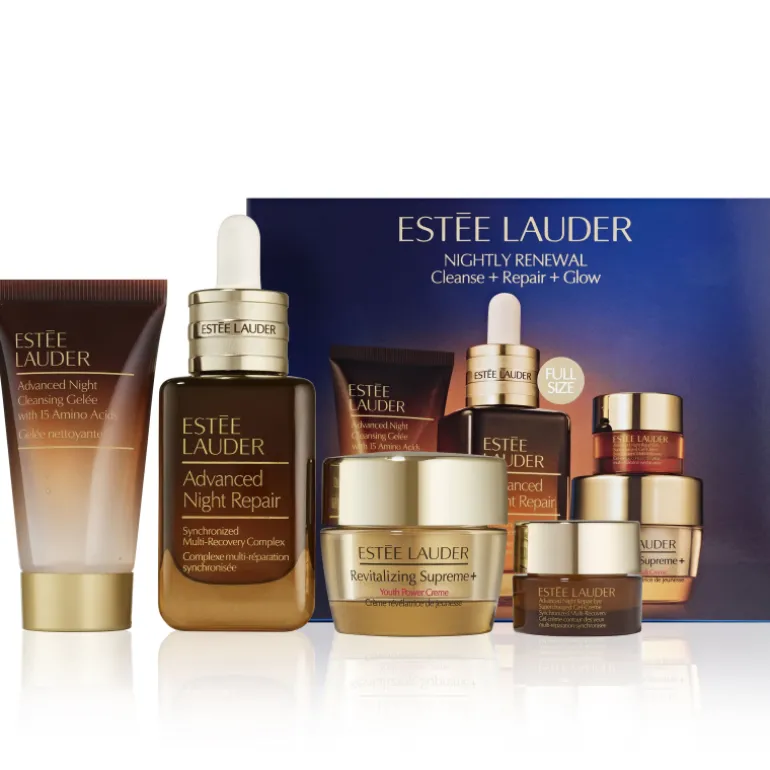 Estée Lauder Set Renovación Nocturna Limpieza + Reparación + Luminosidad. Descubre estas fórmulas de alto rendimiento para ayudar a reducir el aspecto de líneas y arrugas y revelar una piel bella y de aspecto saludable.