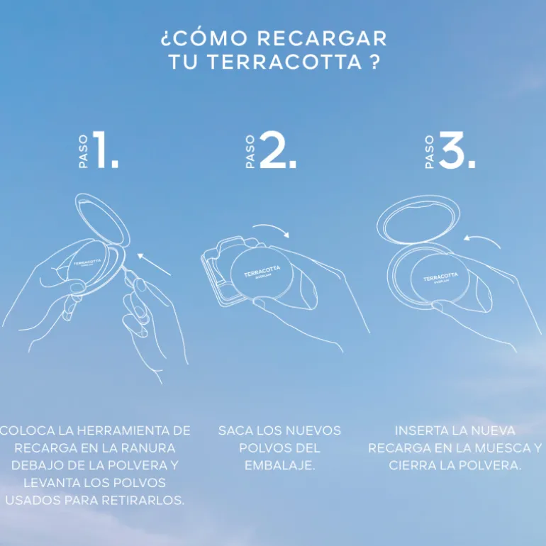 Aplicar los polvos con la brocha Terracotta sobre las zonas más prominentes del rostro, como los pómulos, el puente de la nariz y la parte superior de la frente, para estructurarlo y aportar una calidez delicada a la tez.
