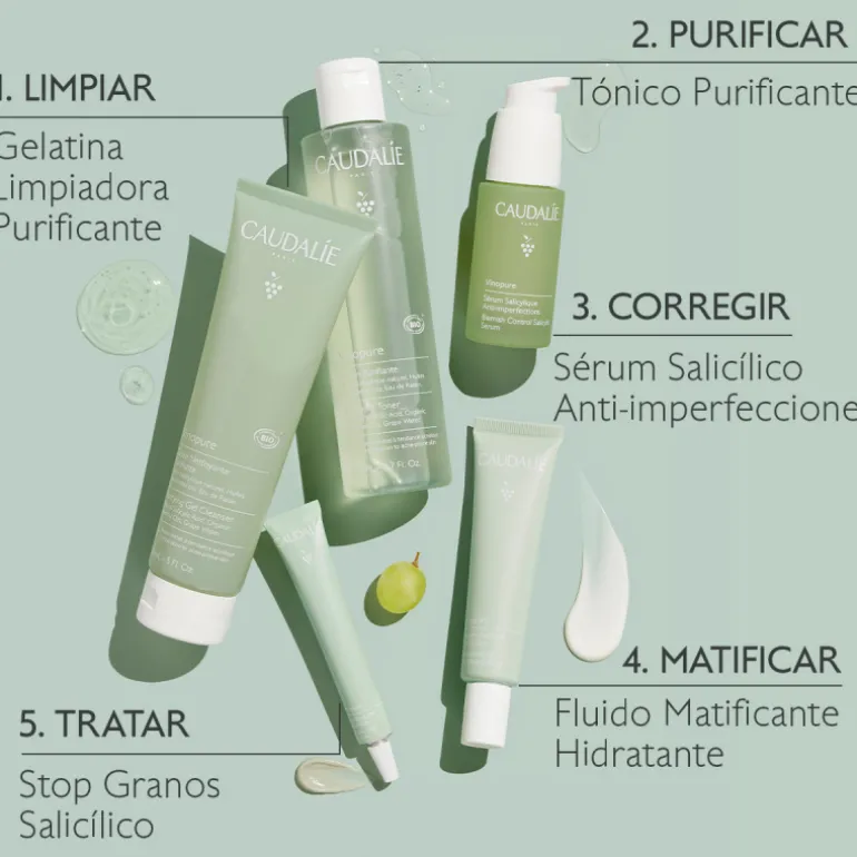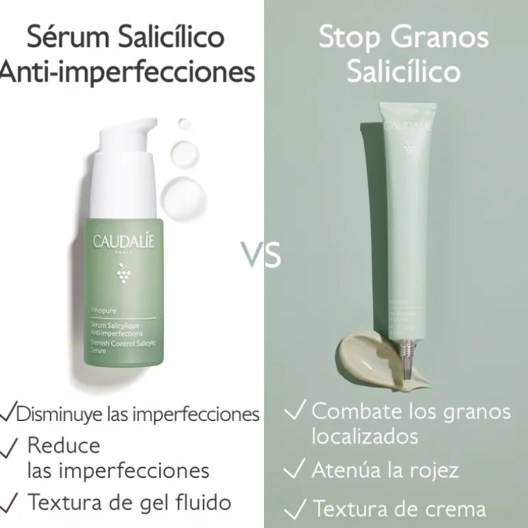Aplícate el Stop Granos Salicílico Vinopure directamente sobre el grano mañana y noche y retócate en cualquier momento del día. Evita el contorno de los ojos.