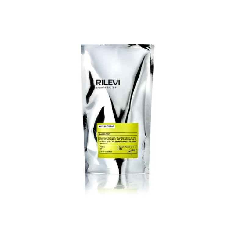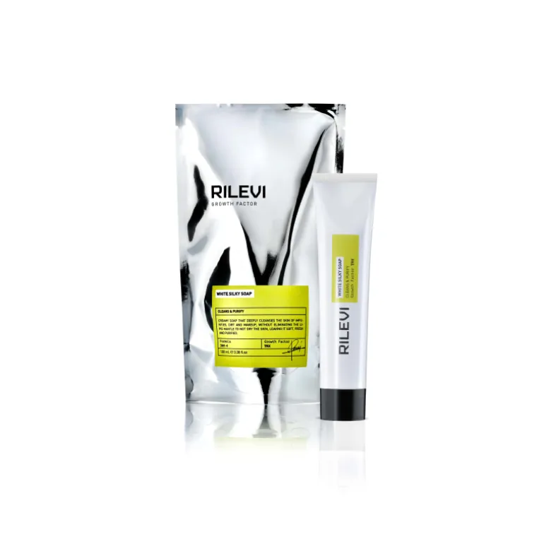 Rilevi White Silky Soap Cleans & Purify Soap. Crema jabonosa que limpia en profundidad nuestro rostro de impurezas, suciedad y maquillaje sin eliminar nuestro manto lipídico, por lo que no reseca nuestra piel y esta queda suave, fresca y limpia.